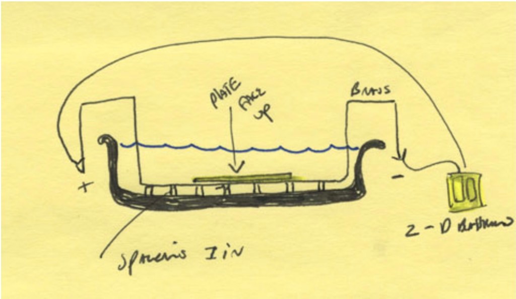 I became interest in trying to push copper sulfate to its limits in 2008, after reading an article by Nik Semenoff (LEONARDO 1991 ” Using Dry Copier Toner in Intaglio and Electro-Etching of Metal Plates”). It was interesting to me because of its use of power, and the possibility for it to become a green resource in a printmaking department. I experimented with the mixture in the article using batteries and a brass rod instead of stainless steel. I also allowed the plate to lie on the rod in the