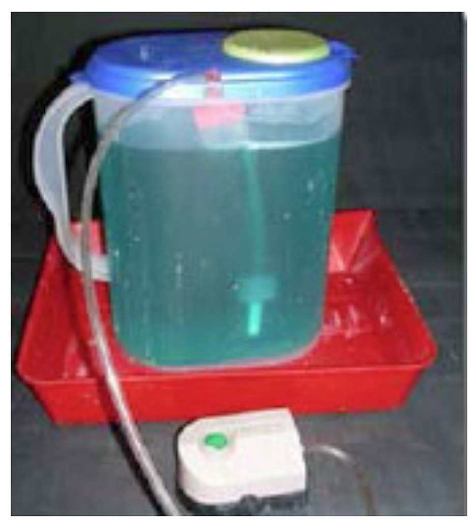 Simple vertical tank: For my research, I found that a vertical tank with air bubbling from the bottom is the best method of introducing oxygen to the solution and keep things circulating. A cheap aquarium pump can be left on all the time to regenerate the mordant. Hydrogen peroxide comes at 3% in drugstores and 12% at beauty salons. While the 3% works, the constant use of it for oxygen will dilute the solution too much, so a stronger version should be sought after. In health food stores, there is 35% available in Canada but may not be so in other countries because of it possible use in bomb making. I use the 35% that I keep in a refrigerator to help it keep its original strength, but never add the full strength to the bath as it releases too much oxygen that is just lost for reaction within the solution.