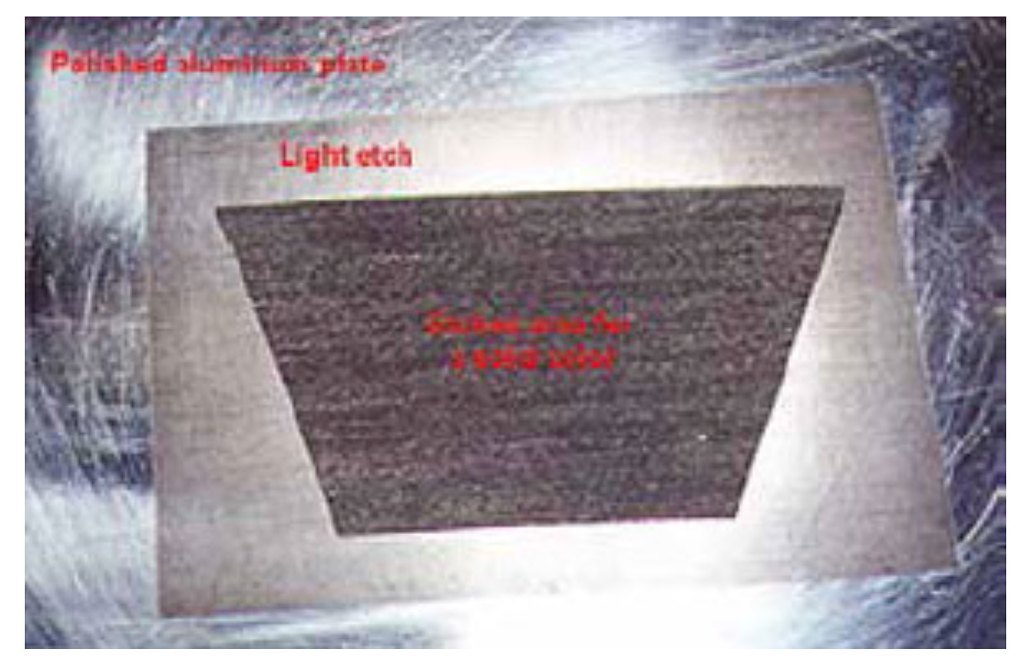 Natural aquatinting on aluminium: Due to the nature of the chemical reaction, the grain of aluminium is exposed as coarse crystalline texture, depending on the depth of the etch. On some plates, the grain may show the direction in which the sheet was rolled while reducing its’ thickness. This depends on the manufacturing of the sheet metal.