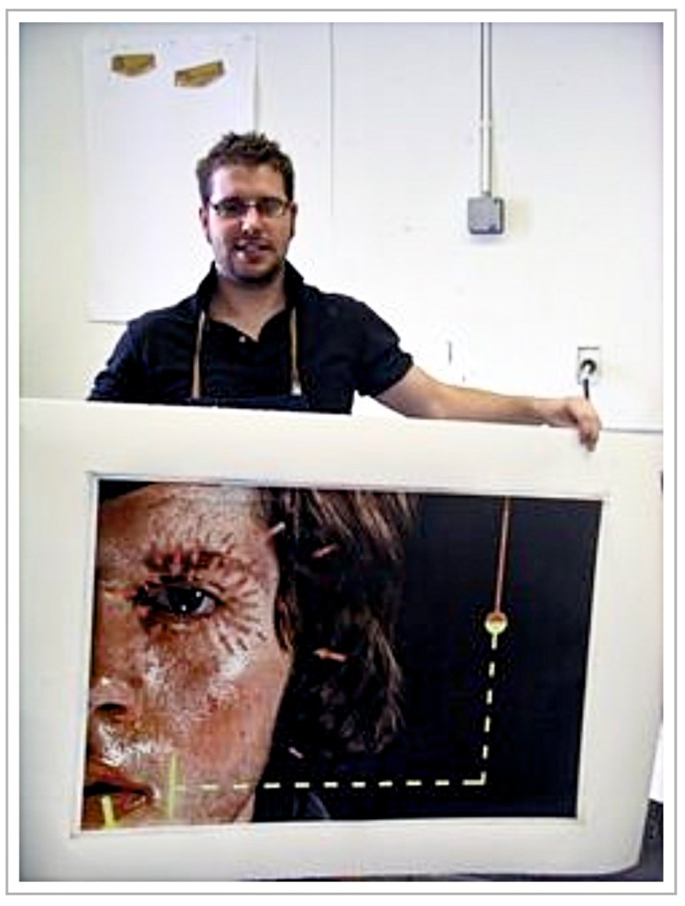 In 2005 two of my graduate students, Justin Myer Staller and Adam Werth were working on very large 4 Color Intaglio-Type prints. Adam was using up to twenty four 24” x 36” plates to create one 6’ x 6’, 4 color Photo Intaglio-Type image which required pin-point registration. As they were making Intaglio-Type plates with clear PETG plastic it seemed obvious to print these plates upside down, registering each plate by looking through the plate and aligning it with the previous printed color.