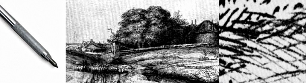 Make sure you use a sharp etching tool to draw into the plate. It is mainly the raised ‘burr’ created by scoring into the substrate that creates the velvety and expressive lines typical for drypoint. Steel needles require frequent sharpening. Ideally use a hardened needle such as Blick’s Carbide Point Scribe (left) or a diamond tip needle. For use in large printmaking classes a sharp chipboard screw with tape wrapped around the shank makes a surprisingly good etching and dry-pointing tool. Right: Etching and Drypoint by Rembrandt: ‘Landscape with a hay barn and flock of sheep’. The diagonal cross hatching on the close up was made using drypoint with the burr removed with a scraper to make the copper plate more editionable (Picture: Smithsonian). More details on Rembrandt’s etching techniques can be found in the free eBook by Peter Morse ‘Rembrandt’s Etching Technique: An Example’.
