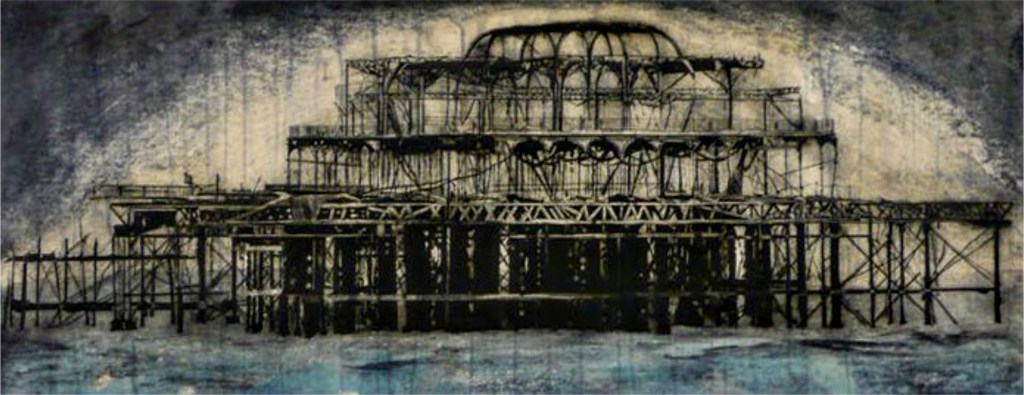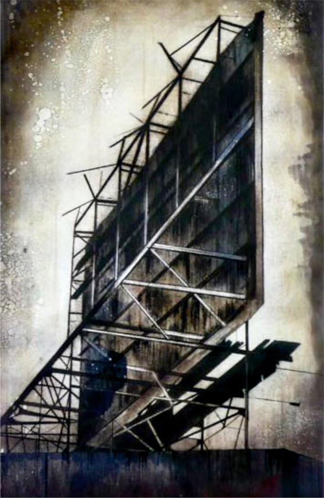 Working on a large scale, I create compositions that exaggerate perspective and squeeze the subject matter tightly into the picture plane in order to create a sense of scale that is intended to create the same powerful impact as the structures they represent. Compositions that draw the viewer in to contemplate the ultimate fragility of our built environment.