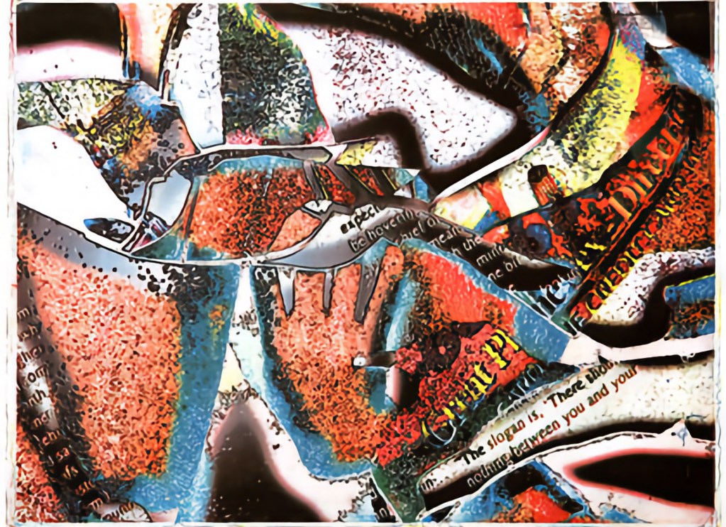 “Fast Forward” builds on Keith Howard’s experience as an artist in thrall with abstraction. The imagery can be thought of as a kind of archeology of magazines and print media as Keith would cut up and re-arrange pictures, actually layers of photos and text found in the pages of magazines. The slogan “The Process is Revealed” is embedded in one of the images, and you have to work at these collage pieces to begin to understand what is being shown. In a way the images are Duchampian – they defy easy classification, and the time element is certainly a factor here. Once Keith would complete a collage it is photographed or scanned and the four color plates are made one channel at a time.