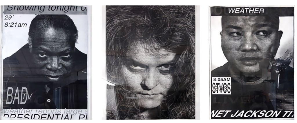 Keith has an eye for types of people to photograph, and he put this together in such a way as to mock the look of T.V. channels like CNN. The images are not so political as a work by say Barbara Kruger or Jenny Holzer, the prints are more of a social satire.