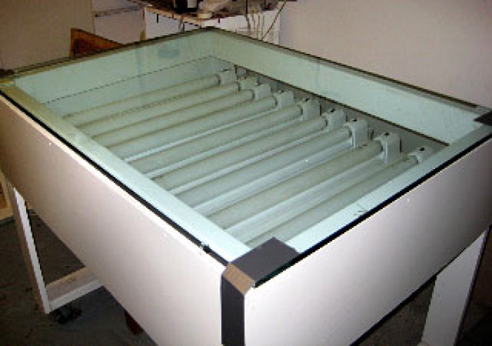 Start by building a box frame. You can use 2×3’s or 2×4’s for the framing wood depending on how big or strong you want it to be. Make a shelf with plywood 6-8 inches from the top. Cover the top with a heavy piece of glass. Place 8-10 florescent light fixtures on the shelf, evenly spaced. Replace the lights with ultraviolet lights. a strip-light UV exposure unit, note that this type is ideal for silkscreen but unsuitable for photo-polymer work. Today, smaller exposure units are often constructed using LED UV bulbs.