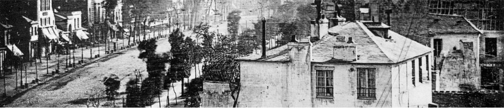 View of the Boulevard du Temple, a daguerreotype made by Louis Daguerre in 1838, is generally accepted as the earliest photograph to include people. It is a view of a busy street, but because the exposure lasted for several minutes the moving traffic left no trace. Only the two men near the bottom left corner, one of them apparently having his boots polished by the other, remained in one place long enough to be visible. (Wikipedia)