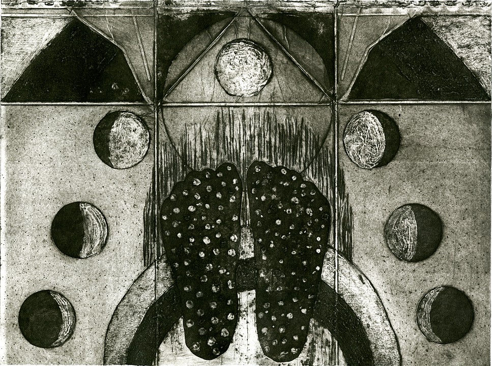 The artist carefully developed a canon of key elements, images, and symbols, which frequently recur and recombine in collages, books, installation, drawings and printed works. The canon of elements includes: images of moon cycles, hands, eyes, beads, squares and circles, wood veneer, spiders, leaves and flowers and many kinds of repeated forms such as fields of stippled marks, dashes or bundles of lines and accumulations.