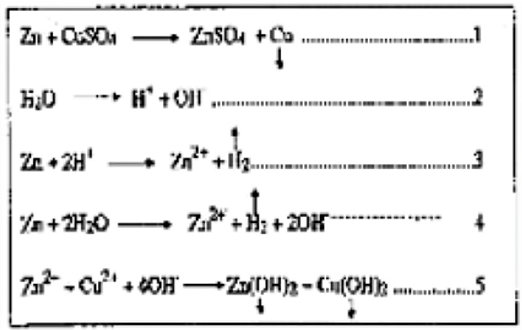 The chemical process involved is basically very simple. Zinc has a much higher electrode potential ( Zn2+ = -0.76) than copper ( Cu2+ = +0.34), and as a result it displaces copper ions from the copper sulphate solution (CuSO4), and the